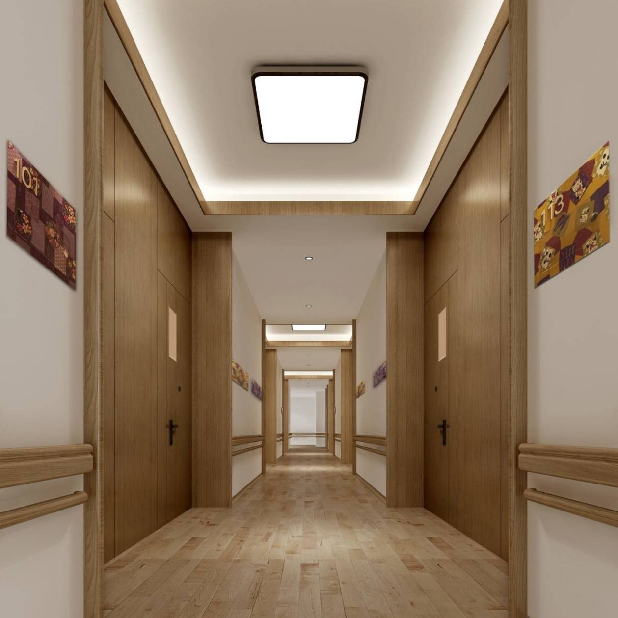 �� 护理公寓:全屋护理床、防滑地板、墙面拉绳报警、毫米波雷达颠仆监测,涵盖所有群体。